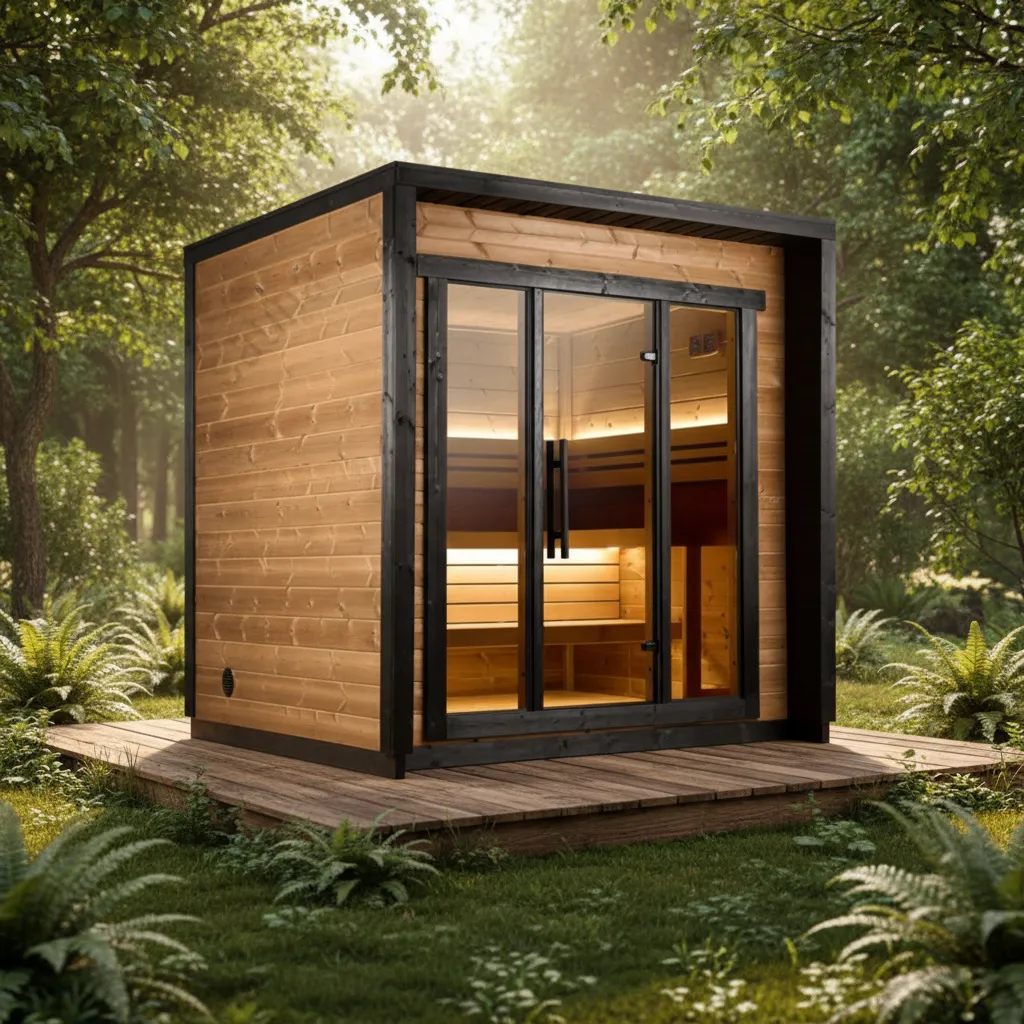 A premium outdoor sauna built from natural red cedar with a full tempered glass front. Clean, modern design that looks as good as it performs. Seats up to 4 people across multi-tier benches and comes equipped with the Harvia The Wall 6KW electric heater as standard.