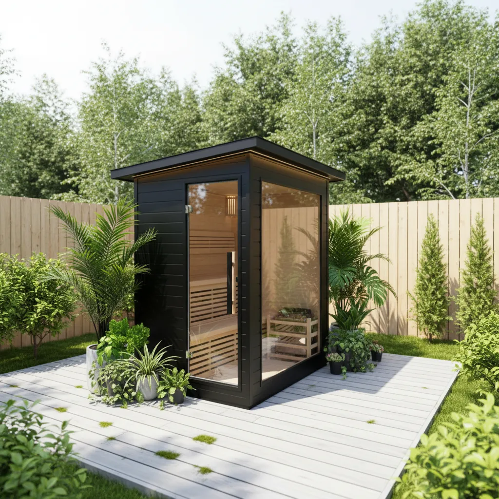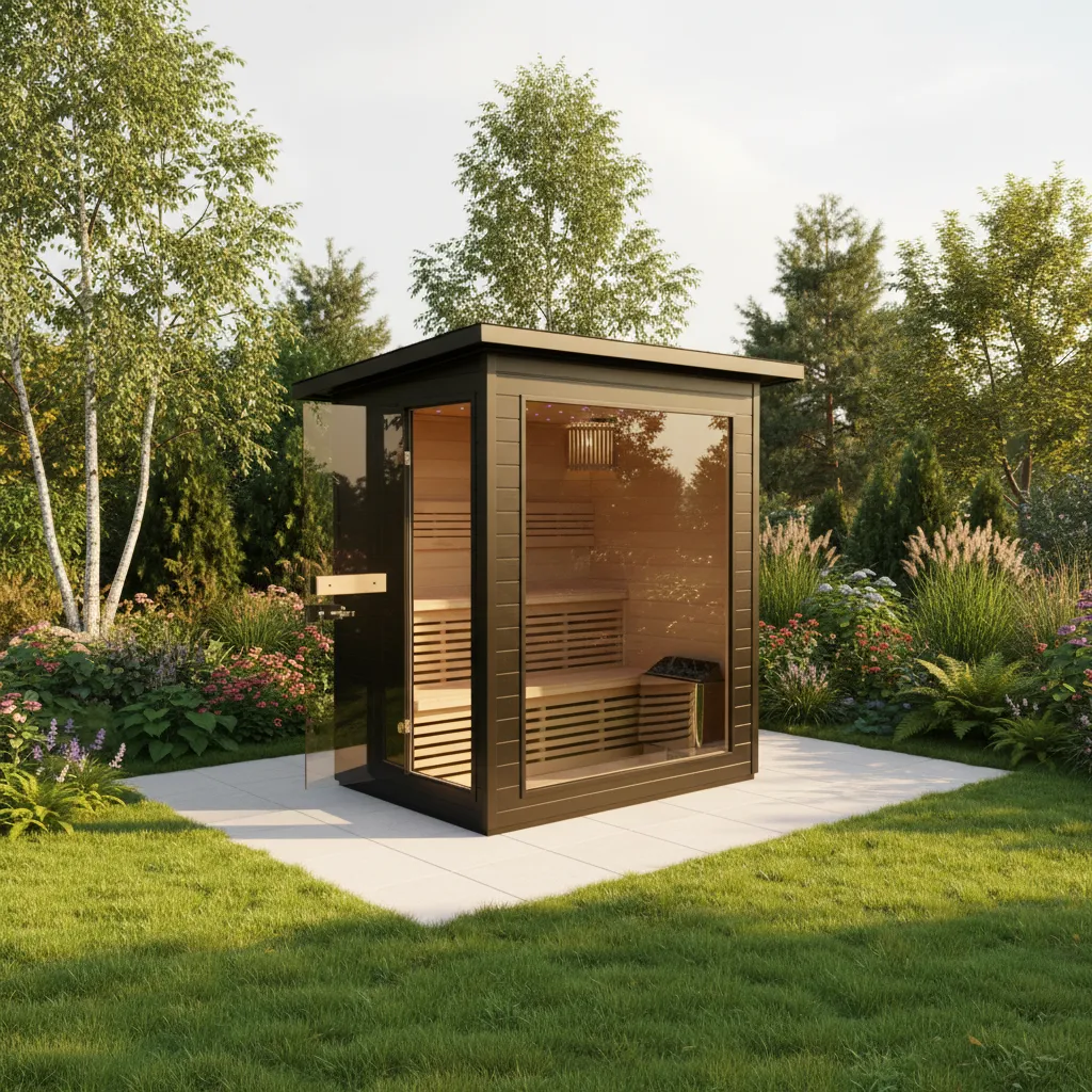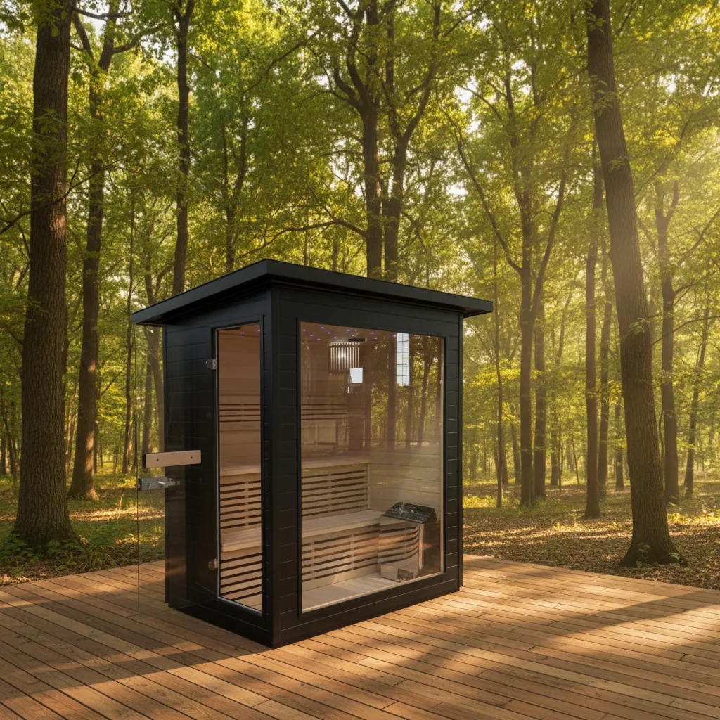 Red cedar benches with ergonomic contours across multiple seating levels. Subtle integrated LED lighting creates a soothing glow throughout the sauna, designed to handle high heat and humidity. Optional backrests and accessories available.