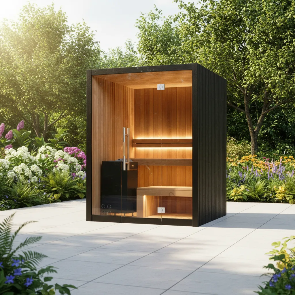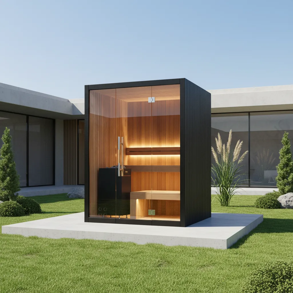 Red cedar benches with ergonomic contours across multiple seating levels. Subtle integrated LED lighting creates a soothing glow throughout the sauna, designed to handle high heat and humidity. Optional backrests and accessories available.