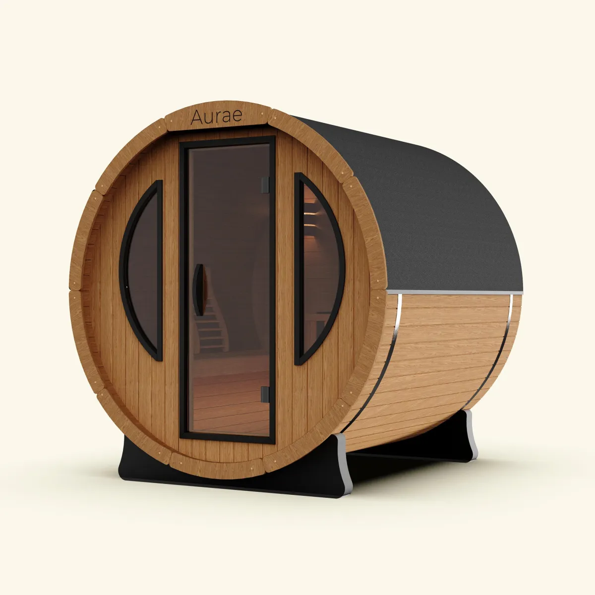 The sauna comes equipped with the Harvia The Wall (HSW600400M) in black steel. Compact, wall-mounted, and designed for medium-sized saunas. Holds approximately 20kg of sauna stones for even heat distribution and steam when water is poured over the stones. Scandinavian design, built for durability, and ideal for residential use.